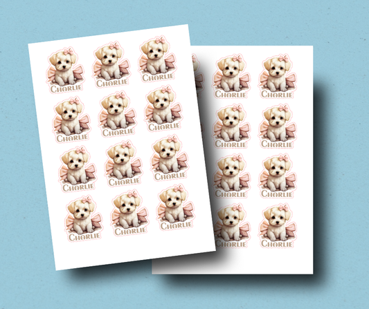 Cute Pink Bow Dog - Personalised Christmas Name Label Stickers