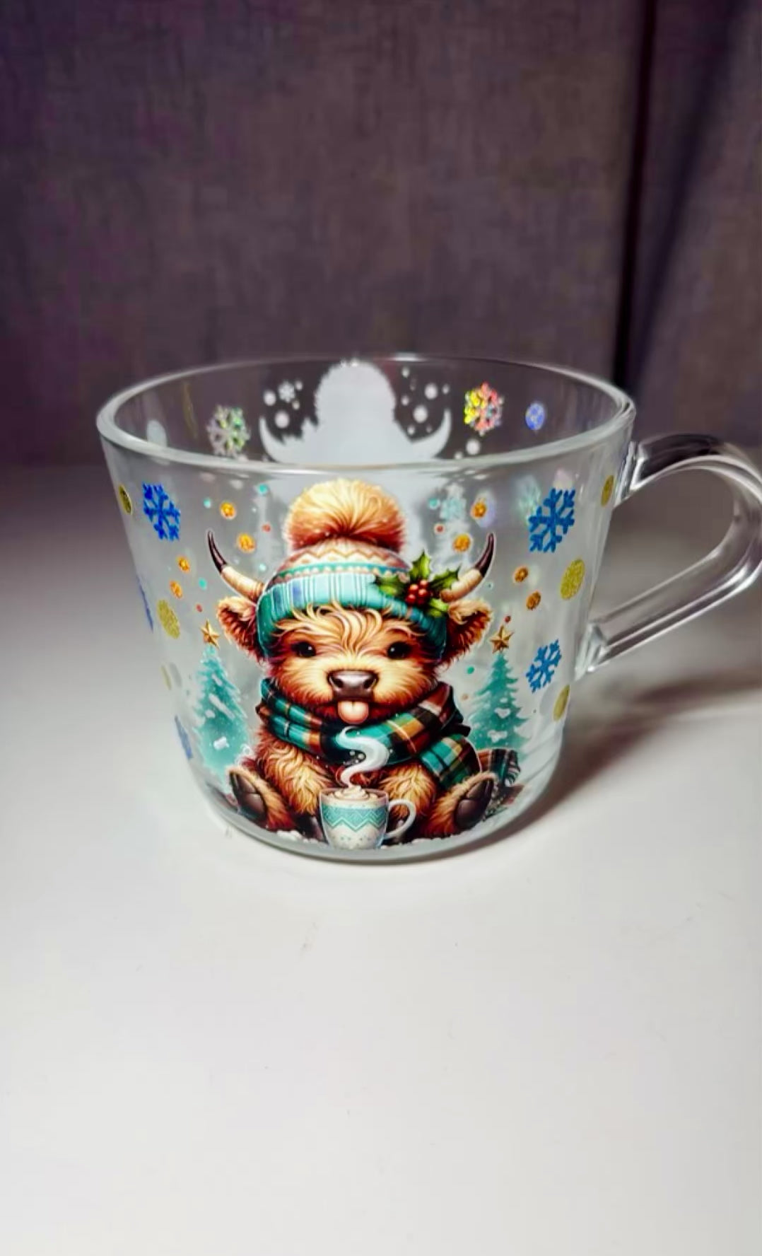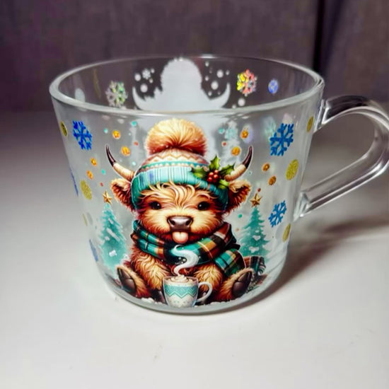 Bring cosy winter charm to your cuppa with this delightful clear glass mug, featuring an adorable Highland cow bundled in a beanie and tartan scarf. Perfect for hot chocolate, tea, or your morning coffee, it adds a cheerful touch to any kitchen and makes a thoughtful seasonal gift.